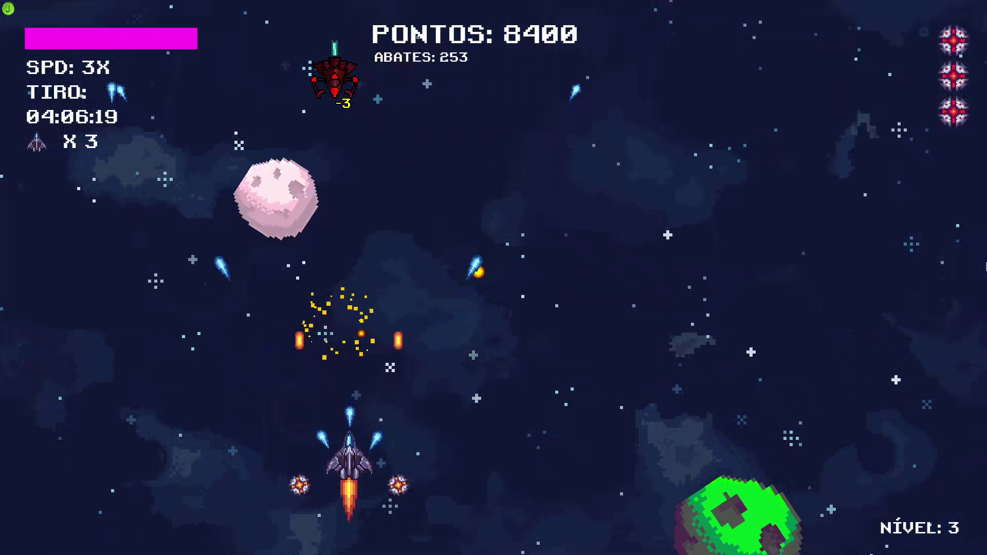 Good game, I just think maybe there should be something like asteroids in the boss fights also? Because now they're quite empty and it's simple to beat(at least the first 2 bosses) with minimal movement. And then just polish stuff, but it's a good game. (Also when you start the game if you pause instantly, the pause menu is under the instructions on how to play)